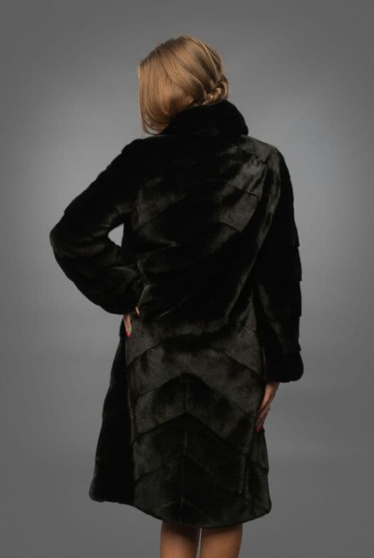 Эффектная и статусная шуба из меха норки черного цвета в сложной подборке меха "паркет".
