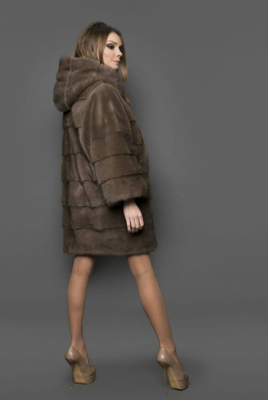 Стильная женская шуба из меха норки цвета "соболь" с капюшоном, выполнена в силуэте "оверсайз", в комбинации стриженной и не стриженной норки.Рукав 7/8, модель заужена к низу.
