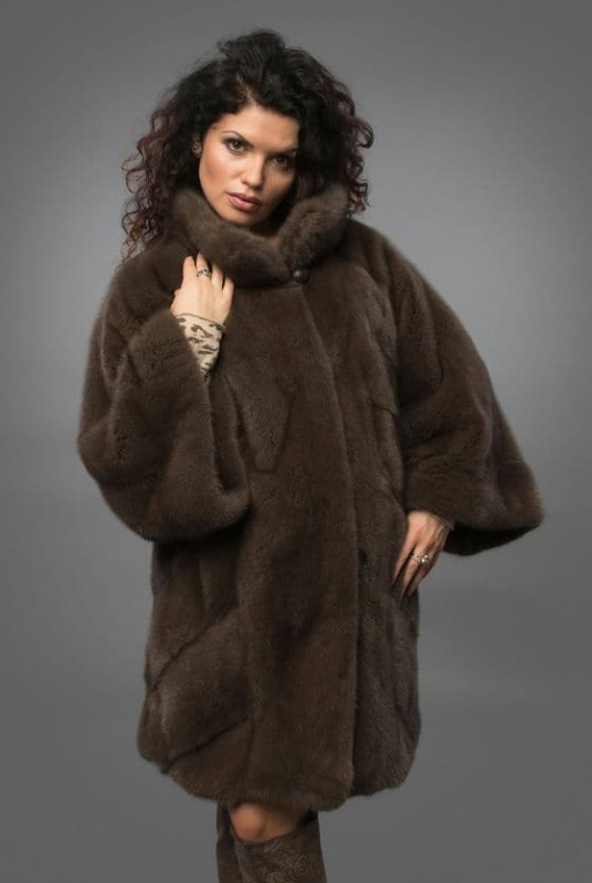 Шуба из аукционного меха норки цвета "соболь" в интересной и сложной подборке меха.Ворот - стойка. Рукав укорочен 7/8. Силуэт зужен к низу. Длина 85 см.