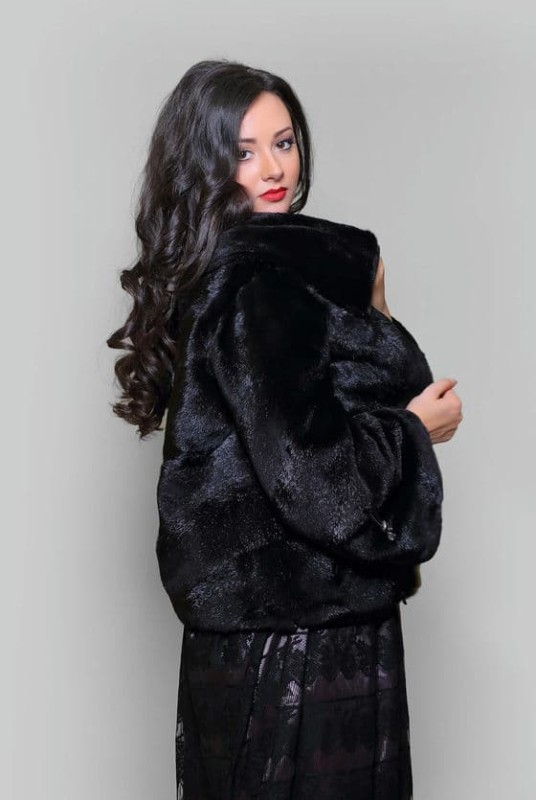 Шуба женская из меха норки чёрного цвета на змейке, с лаковыми вставками.