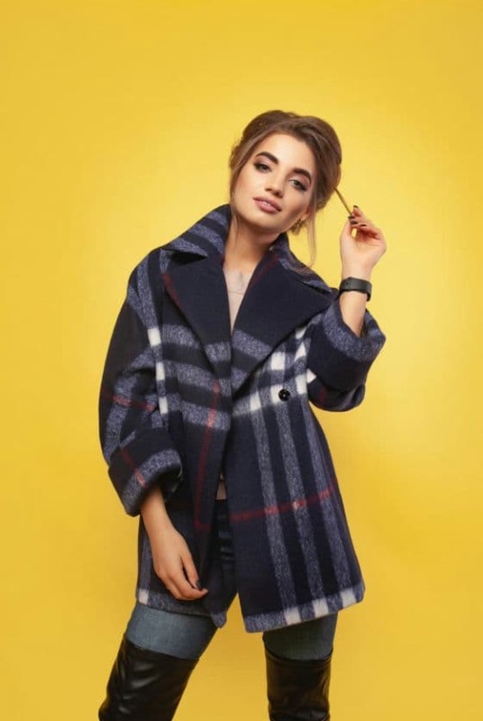 Короткое шерстяное пальто синего цвета с принтом клетка.