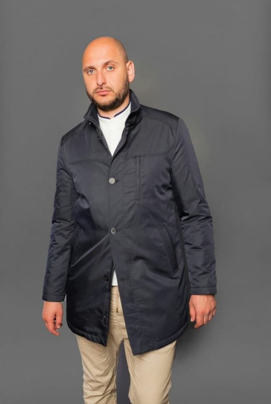 Для ценителей элегантности - удлиненная тканевая куртка темно-синего цвета.